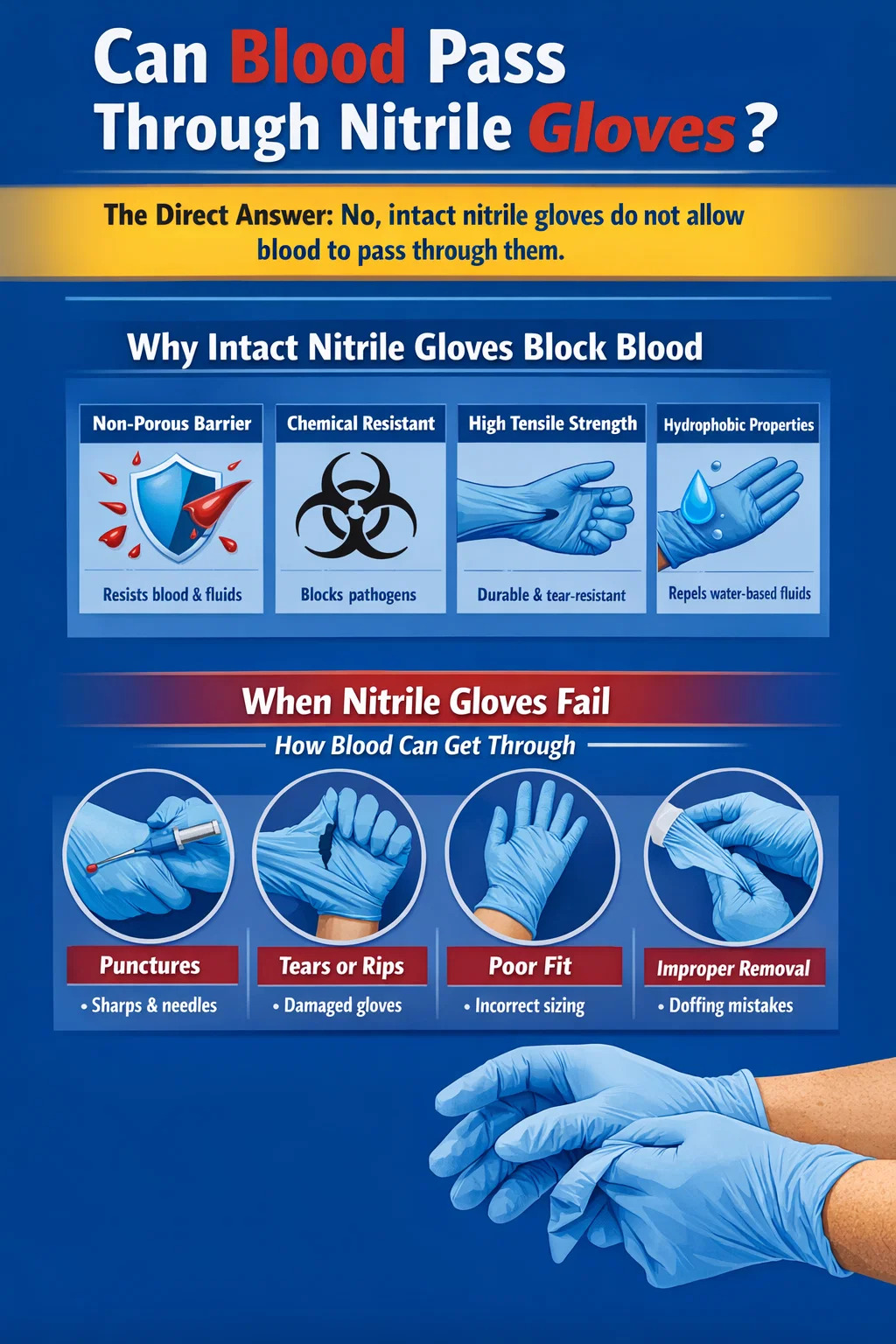 그러나 "온전한"이라는 단어는 그 진술에서 엄청난 무게를 지닙니다. 장갑이 찢어지거나, 구멍이 나거나, 발견되지 않은 제조 결함이 있거나, 잘못 사용되는 경우 혈액 또는 그 안에 포함될 수 있는 병원균이 피부에 닿을 수 있습니다. 장갑 소재 자체는 표준 사용 조건에서 혈액의 수동적 침투를 흡수하거나 허용하지 않지만 물리적인 파손으로 인해 모든 것이 달라집니다.