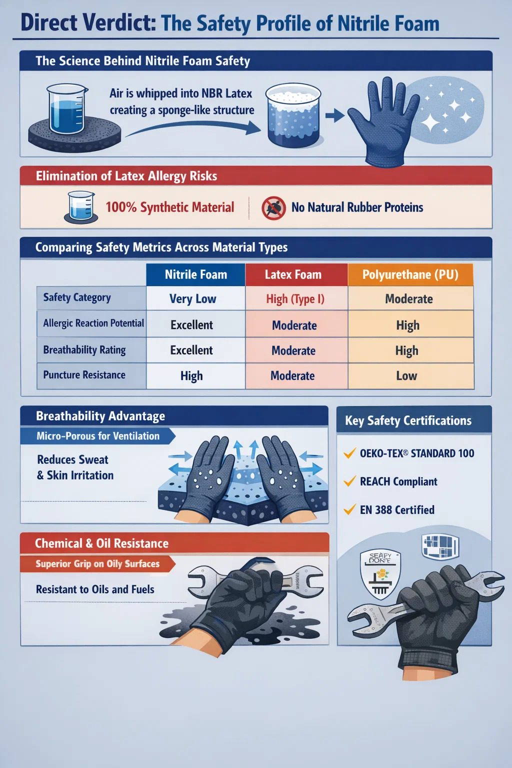 안전에 대한 이해 니트릴 폼 폴리우레탄(PU)이나 라텍스와 같은 다른 일반적인 코팅 재료와 비교가 필요합니다. 아래 표는 사용자 건강과 보호 측면에서 니트릴이 얼마나 뛰어난지 강조합니다.