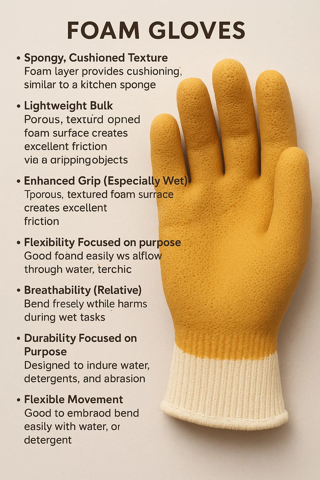 폼 장갑 독특한 소재 구조와 기능적 특성으로 정의됩니다. 주요 특징은 다음과 같습니다.