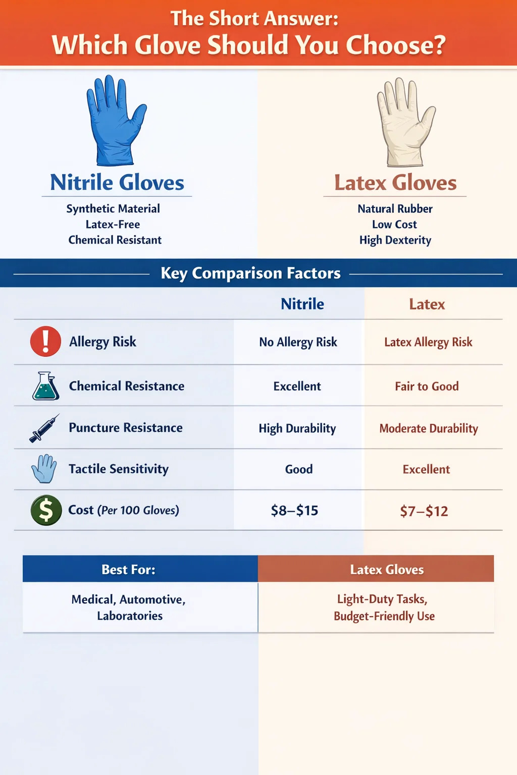 니트릴 장갑은 알레르기에 안전한 특성, 혈액 매개 병원체에 대한 강력한 장벽 보호, 소독제 및 약물에 대한 우수한 화학적 저항성으로 인해 이제 대부분의 의료 환경에서 표준이 되었습니다. FDA는 니트릴 장갑과 라텍스 시험용 장갑을 모두 클래스 II 의료 기기로 분류합니다. 이는 둘 다 장벽 보호에 대한 규제 표준을 충족하지만 니트릴은 알레르기 문제를 완전히 방지한다는 것을 의미합니다.